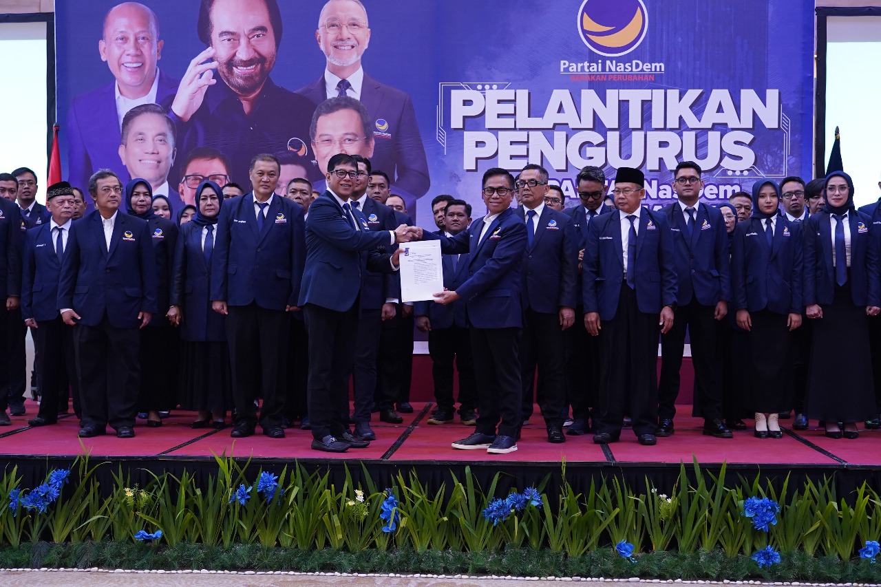 Pelantikan yang berlangsung khidmat ini juga diwarnai dengan semangat konsolidasi dan penanaman 2.000 bibit pohon sebagai simbol komitmen NasDem terhadap pelestarian lingkungan dan pembangunan berkelanjutan.