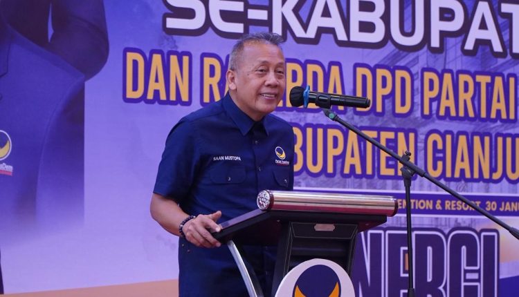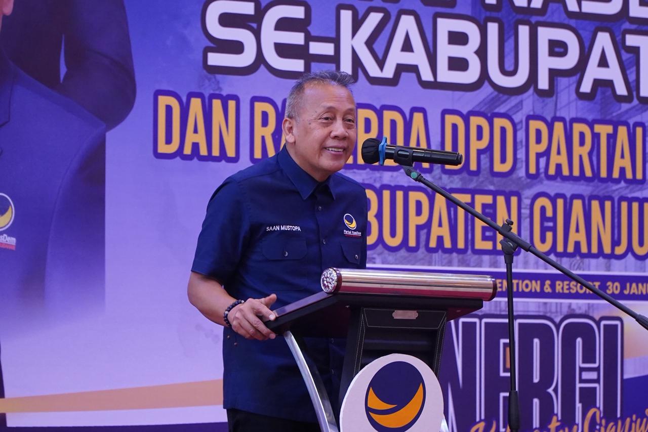 Cianjur — Wakil Ketua Umum Partai NasDem Saan Mustopa menegaskan pentingnya percepatan konsolidasi struktur partai hingga tingkat kecamatan sebagai fondasi utama menghadapi Pemilu 2029. Penegasan tersebut disampaikan saat pelantikan 32 Dewan Pimpinan Cabang (DPC) Partai NasDem se-Kabupaten Cianjur dalam Rapat Kerja Daerah (Rakerda) di Aula Le Eminence, Kecamatan Cipanas, Jumat (30/1/2026).